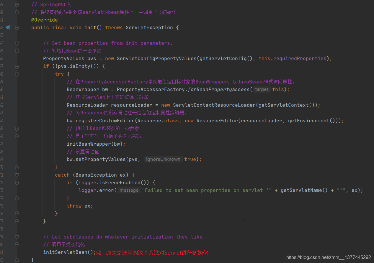 我们可以看见这里只是对一些初始的属性参数进行了设置,具体通过子类调用initServletBean()这个方法来调用。我们点进去看看