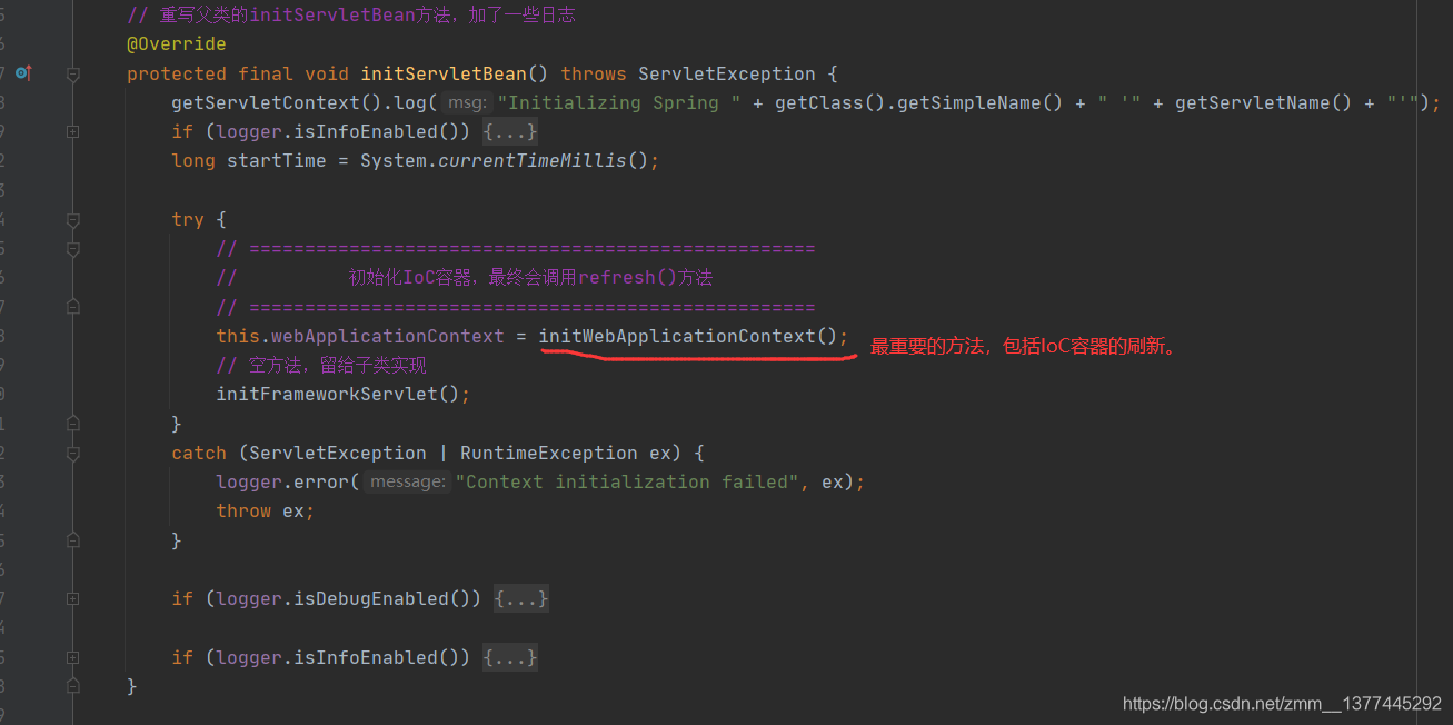 我们可以看到子类FrameworkServlet的initServletBean()方法中添加了一些日志相关的信息,以及一个重要的方法**initWebApplicationContext()**,这个方法最终会调用我们IoC容器的refresh()方法。剩下的initFrameworkServlet()这个方法是个空方法,可以留给我们进行扩展。我们继续跟进initWebApplicationContext()方法。