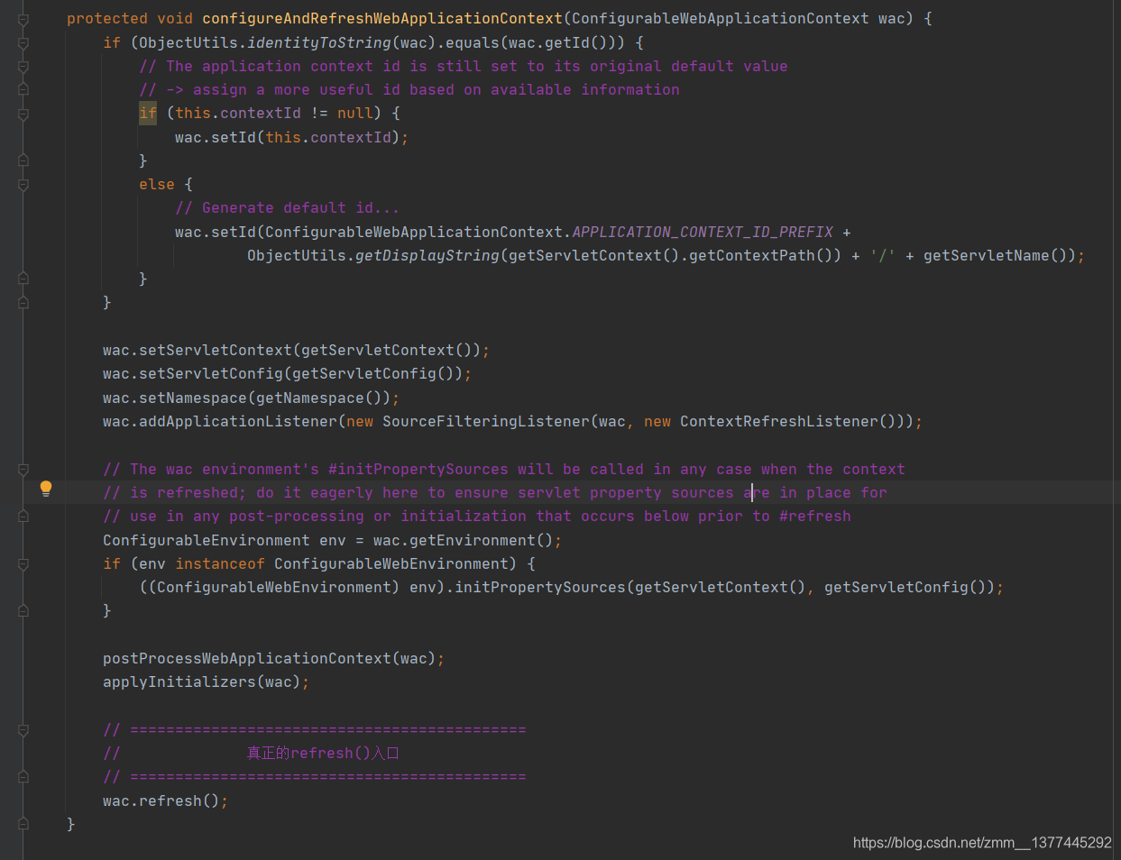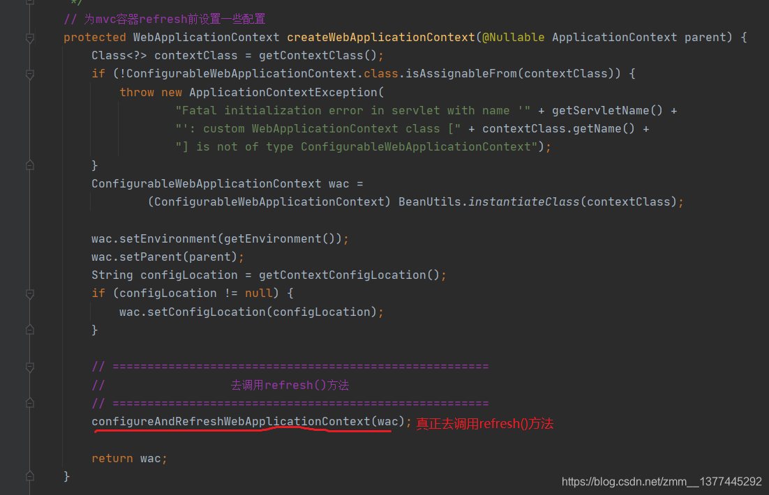 configureAndRefreshWebApplicationContext()方法,终于我们看见了refresh()方法