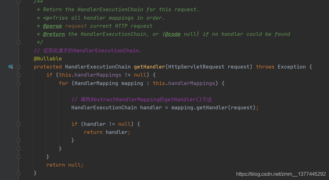 继续点进去,在AbstractHandlerMapping的getHandler()方法中。