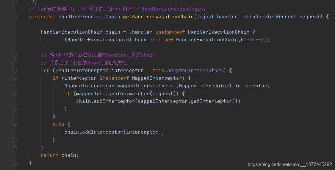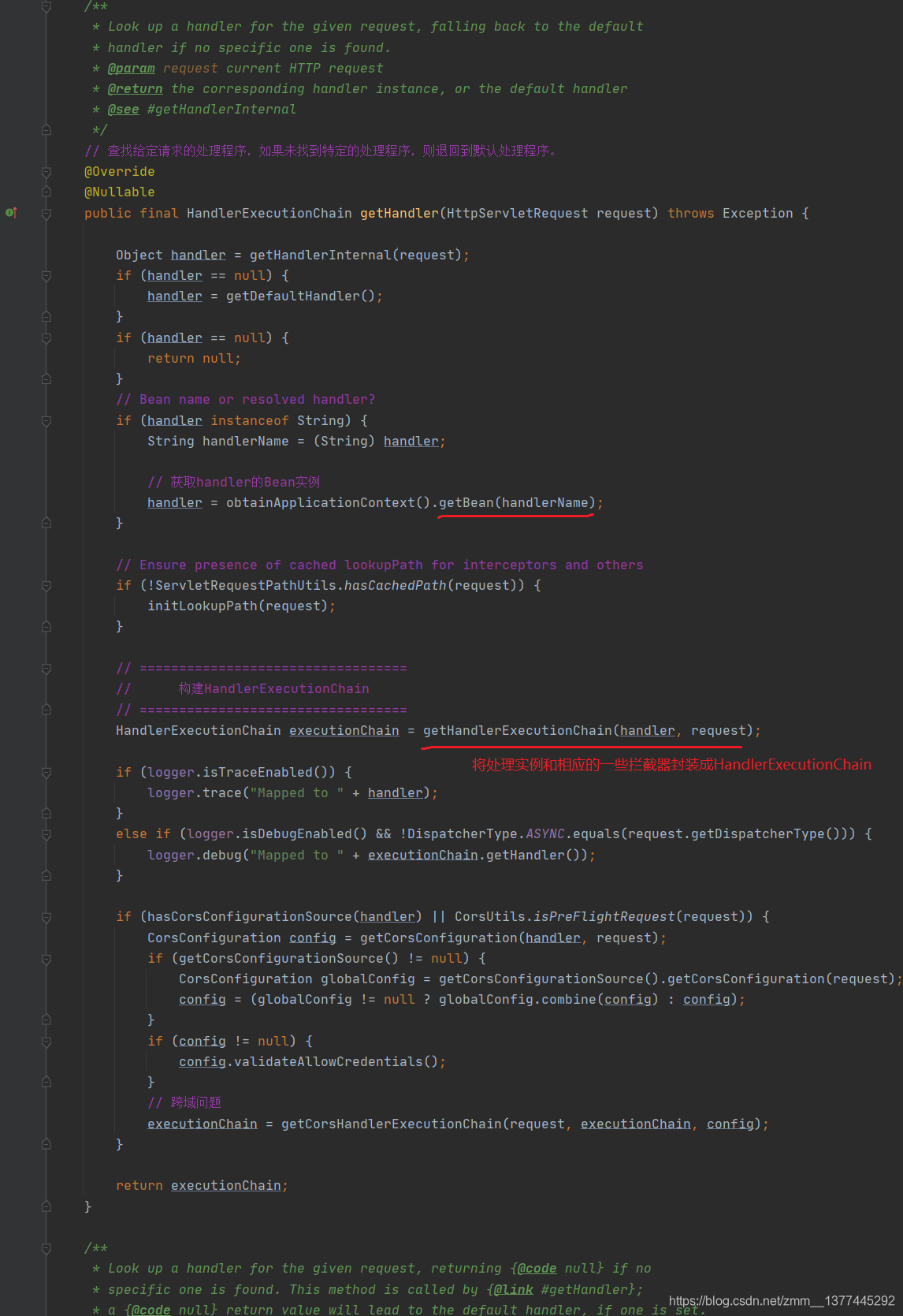 2. 通过getHandler()方法找到请求对应的处理handler的Bean实例以及添加一些拦截器,封装成一个HandlerExecutionChain请求处理链对象