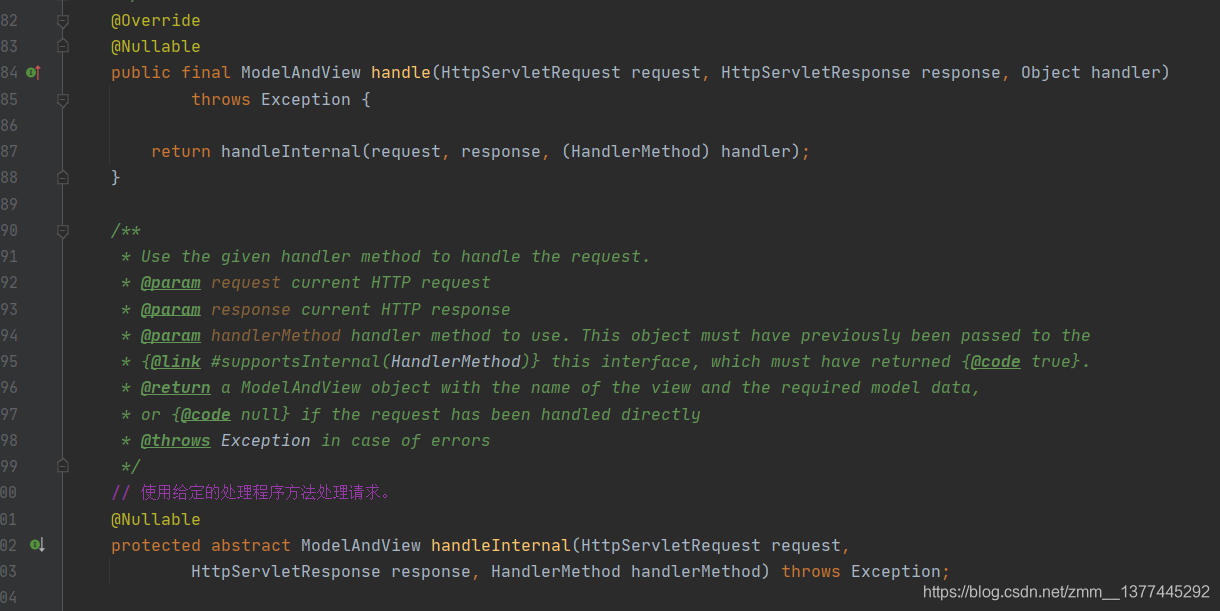接下来是handle()方法,我们点进去看看,他会调用AbstractHandlerMethodAdapter类的handle方法,我们会发现它最后会调用handleInternal()这个方法,交给子类去实现。