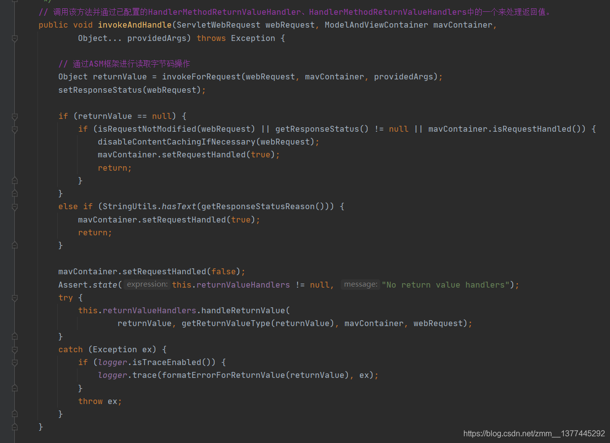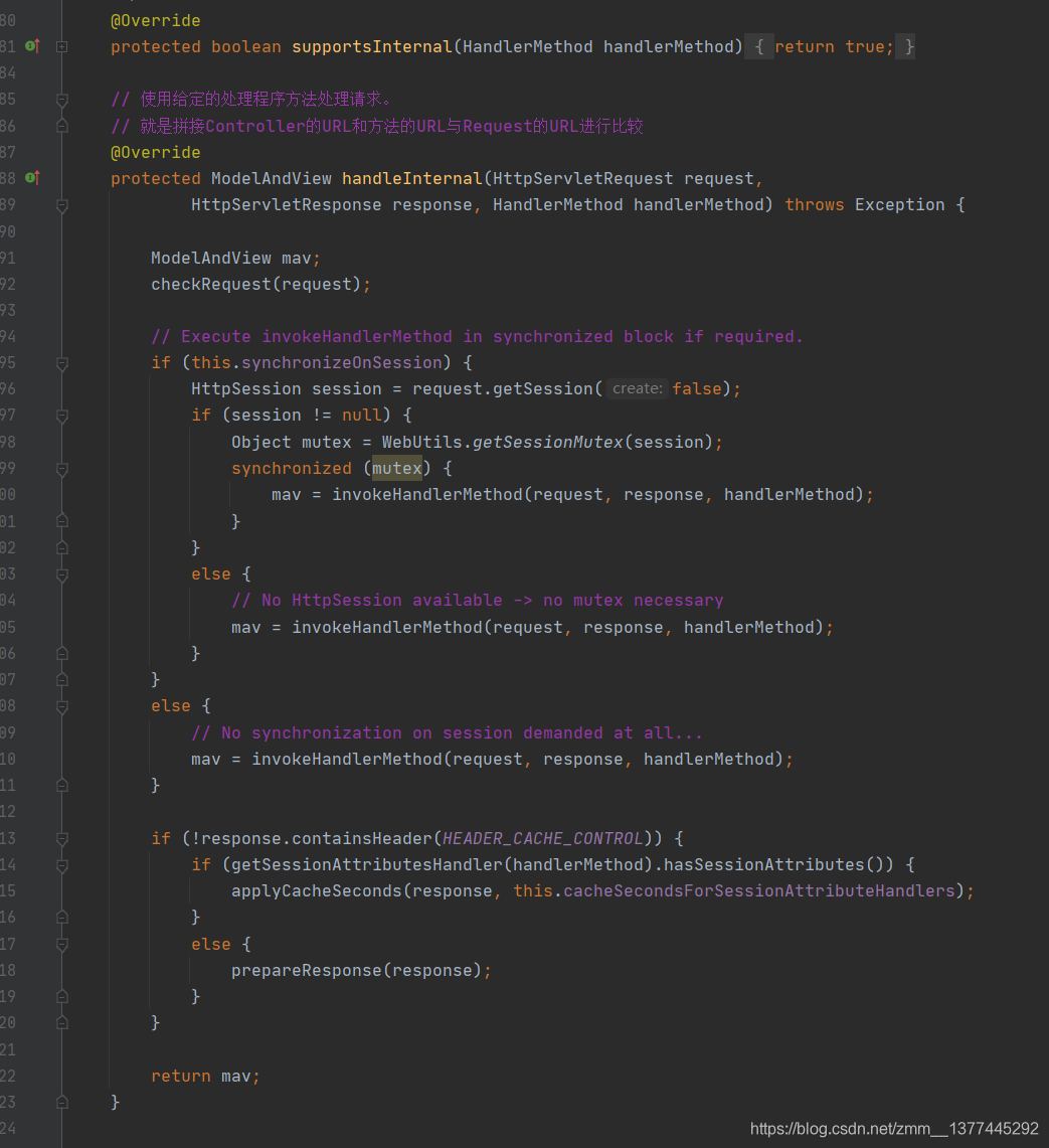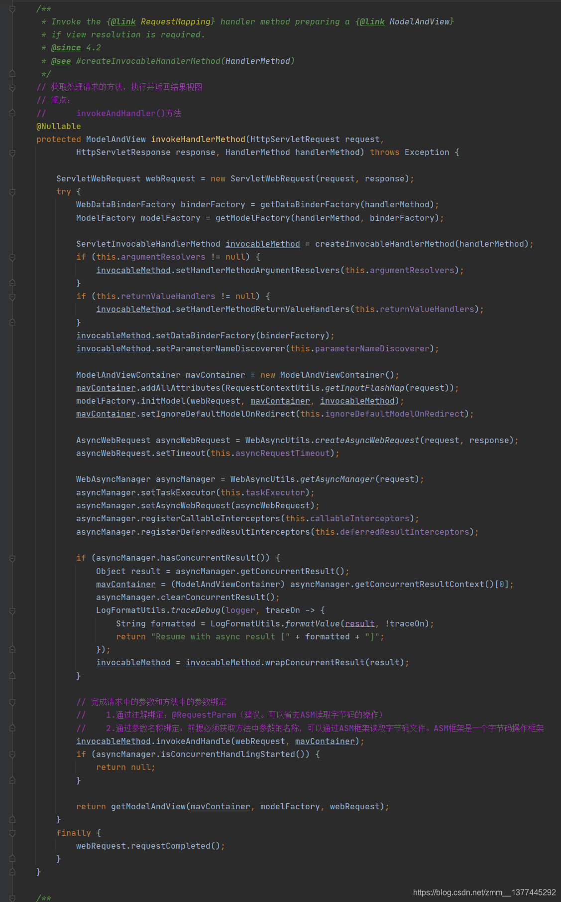 我们可以看见都会调用invokeHandlerMethod()这个方法,跟进去。都是些什么addXXX、setXXX、registerXXX方法。最重要的是invokeAndHandle()方法,它完成了将请求中的参数和方法中的参数进行绑定,通过@RequestParam注解或者是ASM框架。