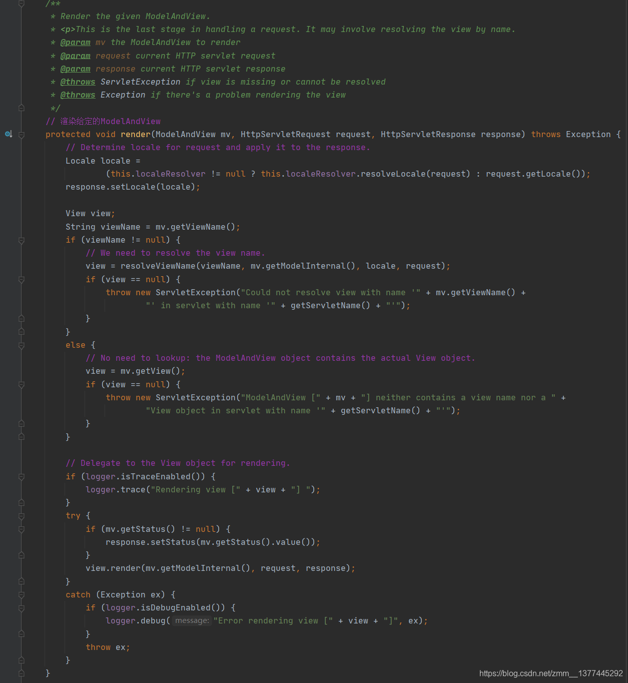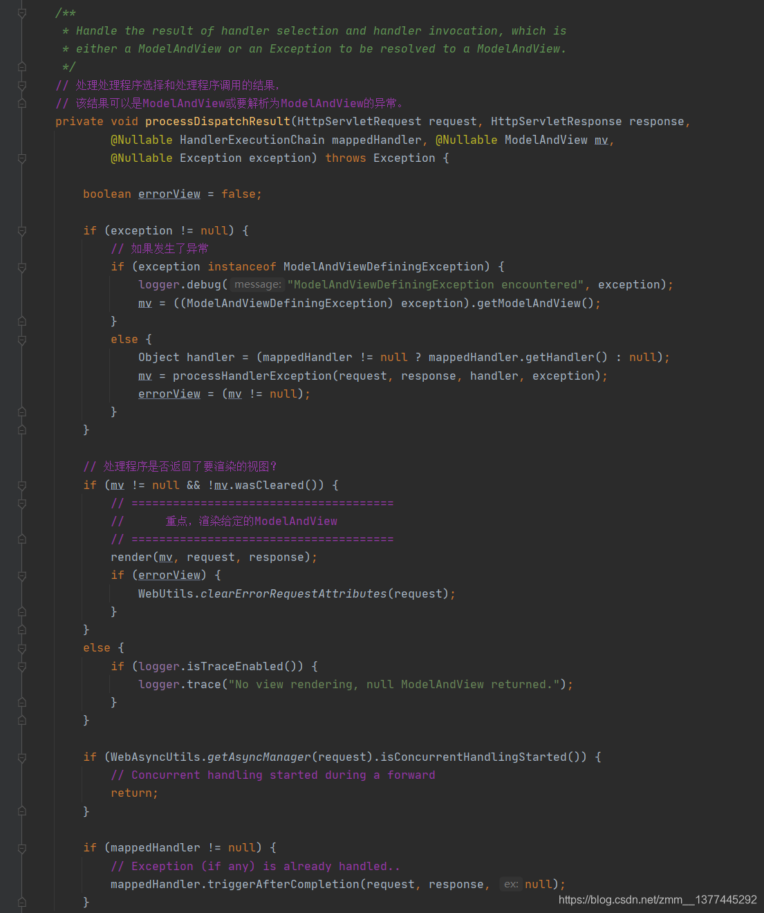 接下来对ModelAndView进行处理,在processDispatchResult()方法中。可以看见对异常的处理和对正常视图的处理。